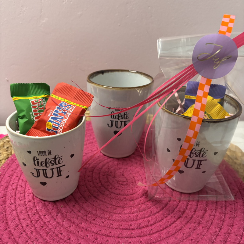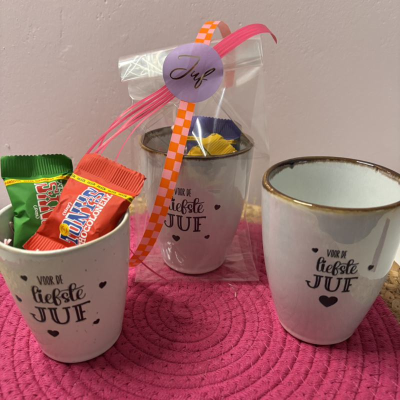 Zoek je een origineel juf cadeau? Ontdek onze mokken met de tekst 'voor de liefste juf'! Een uniek en persoonlijk geschenk om je waardering te tonen aan het einde van het schooljaar, op juffendag of gewoon een moment om dankjewel te zeggen. Je geeft gegarandeerd een glimlach cadeau. Het is een persoonlijk en hartelijk gebaar dat elke juf zal waarderen tijdes haar koffie- of theepauze.