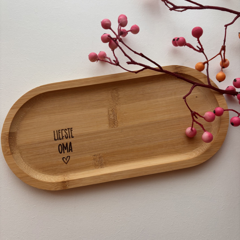 Deze borrelplank is gemaakt van acacia hout en heeft een afmeting van 22,5 x 10,5 cm. De tekst wordt er in gegraveerd, kan er dus niet vanaf. Een houten plank kan niet in de vaatwasser.