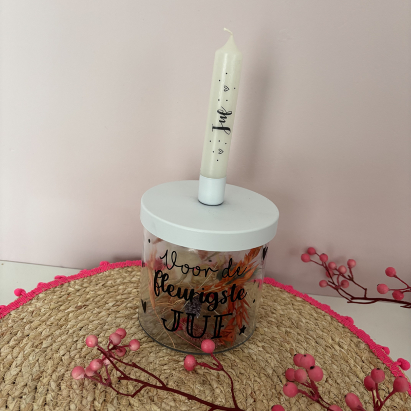 Inclusief droogbloemetjes en een Juf kaars