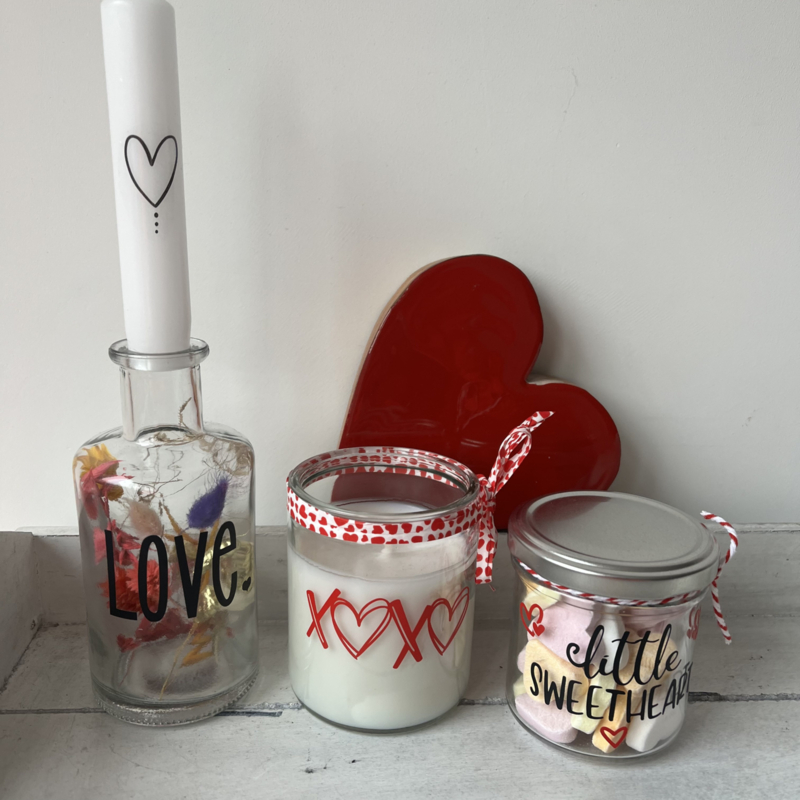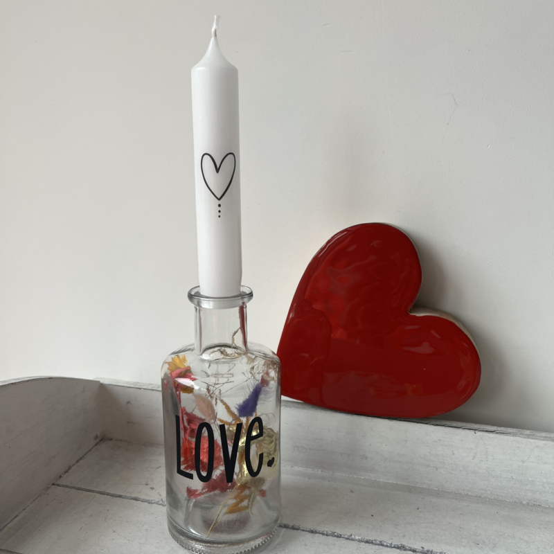 Vaasjes zijn 12 cm hoog, inclusief droogbloemen in het vaasje en een witte kaars met een hartje. Uiteraard pakken we dit leuk in voor je.