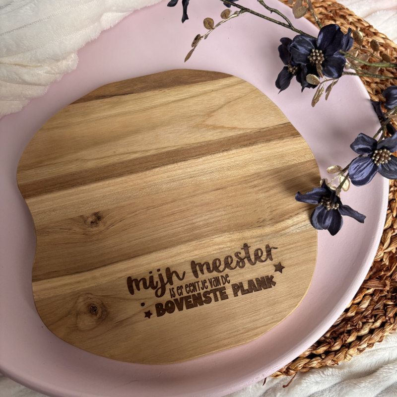 De 'rondvormige' plank is van teakwood en heeft een afmeting van ca 24x24x2 cm.