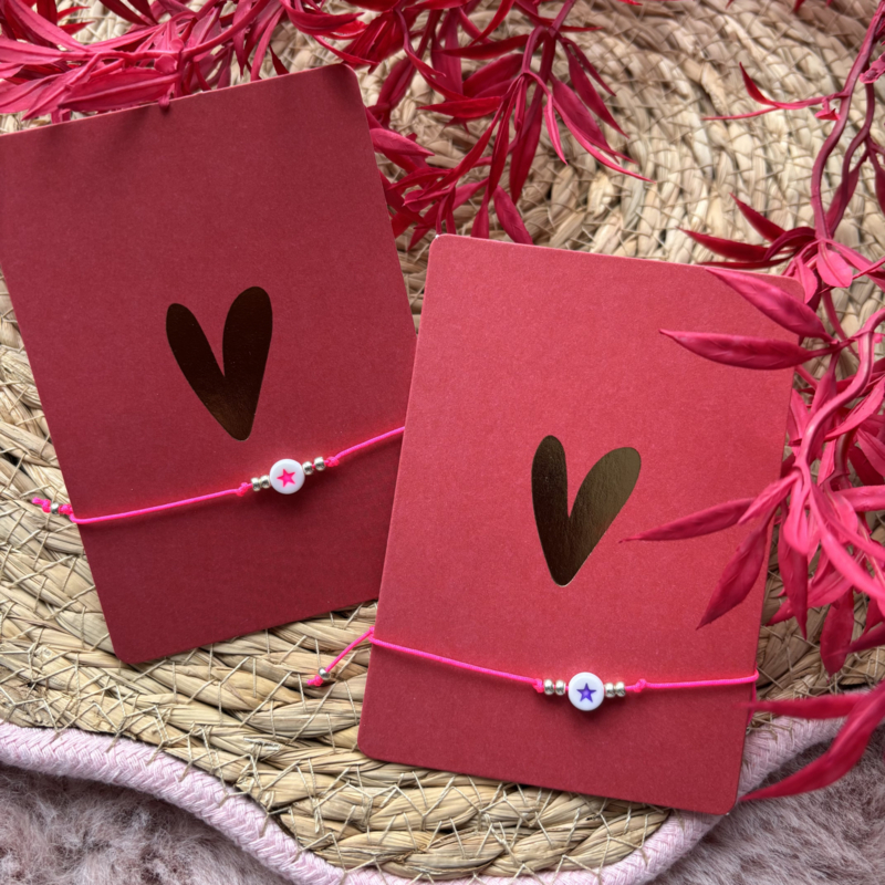 Kaart met armbandje TOPPERKaart met een armbandje, inclusief cadeauzakje. Het armbandje is gemaakt van koordelastiek met een schuifknoop, waardoor verstelbaar voor iedere maat.