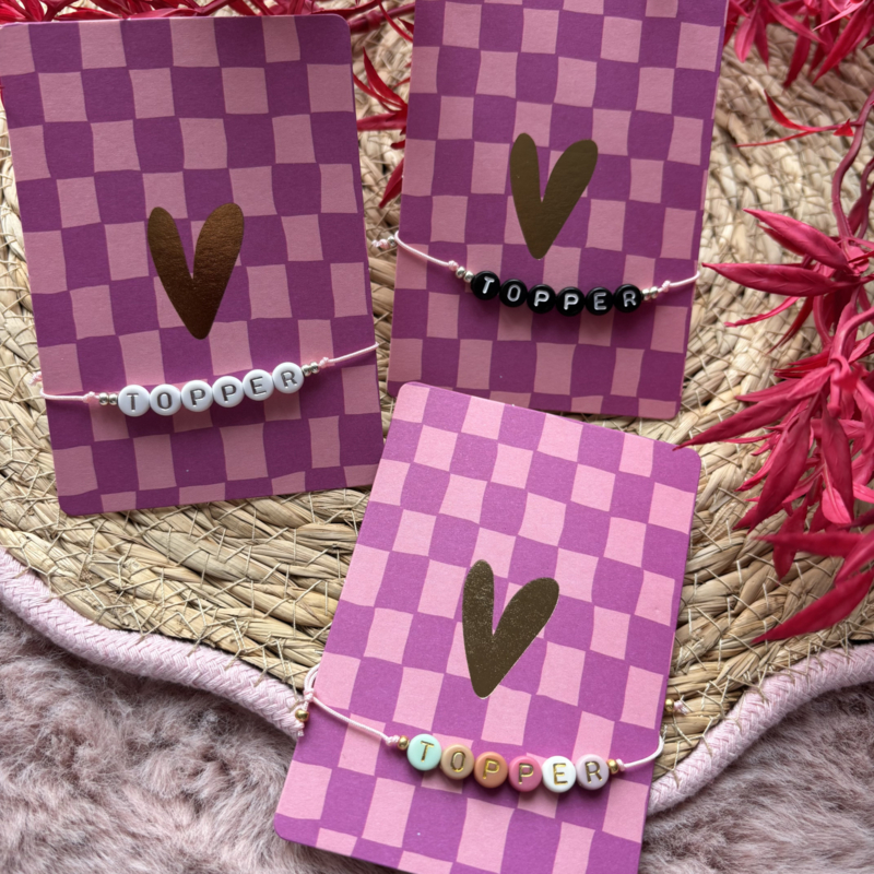 Kaart met armbandje TOPPERKaart met een armbandje, inclusief cadeauzakje. Het armbandje is gemaakt van koordelastiek met een schuifknoop, waardoor verstelbaar voor iedere maat.